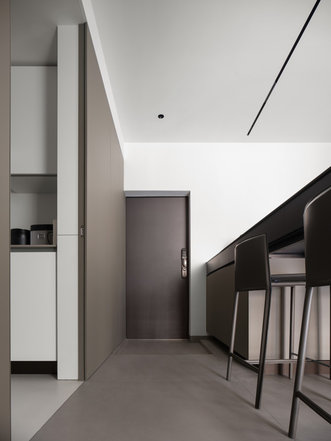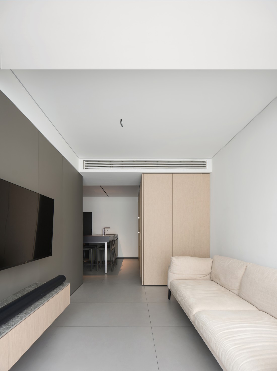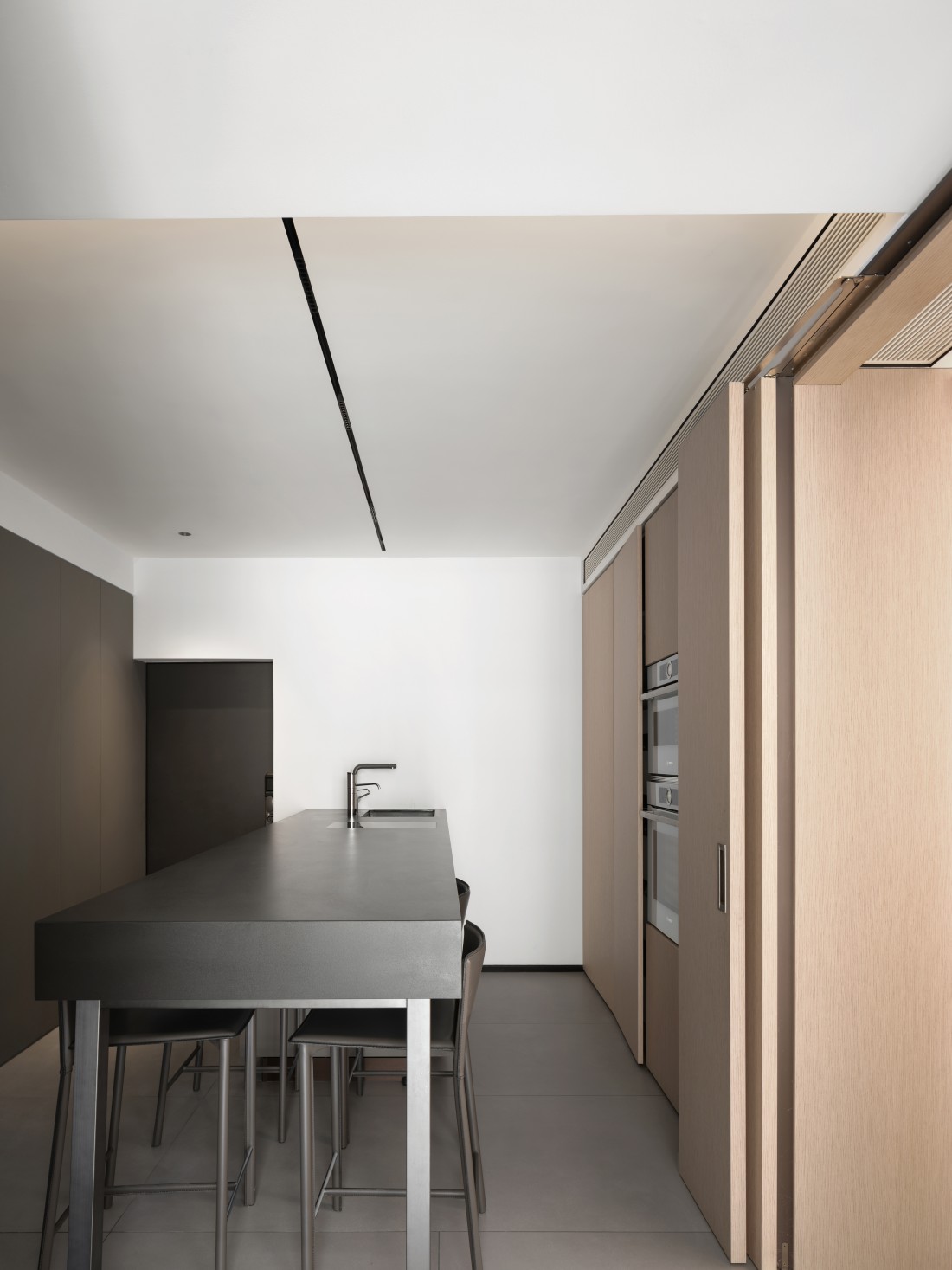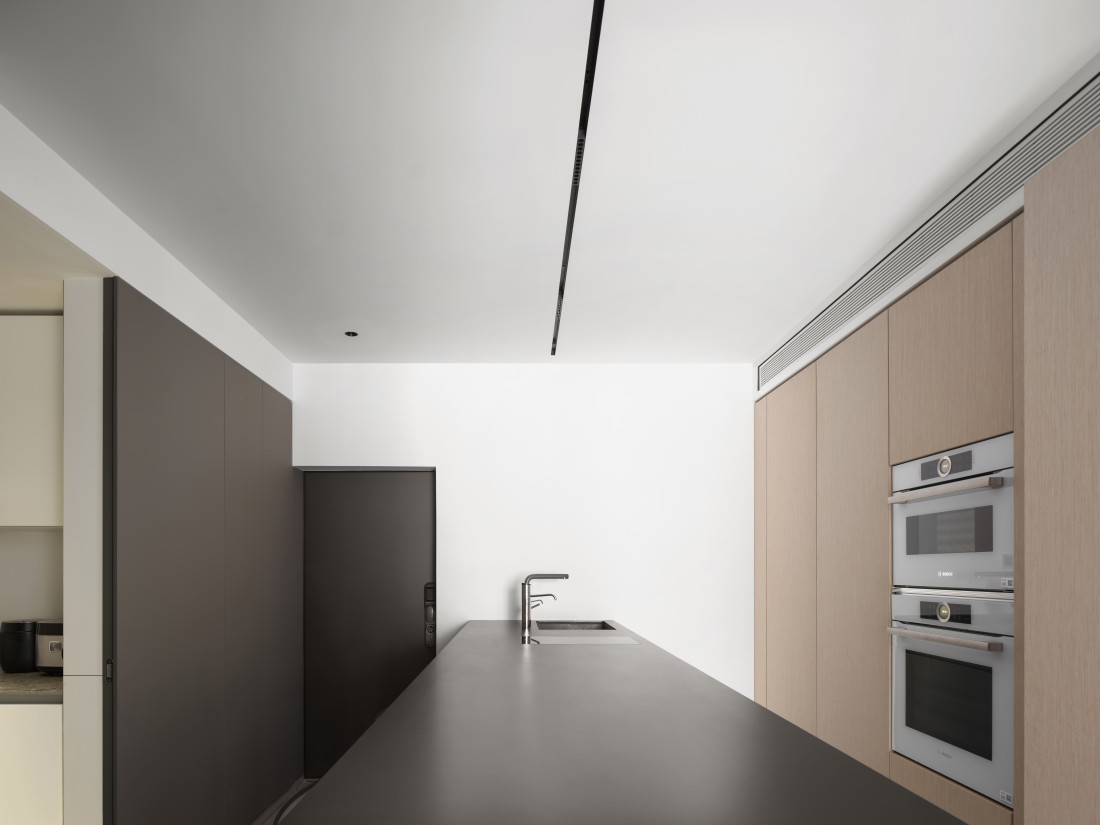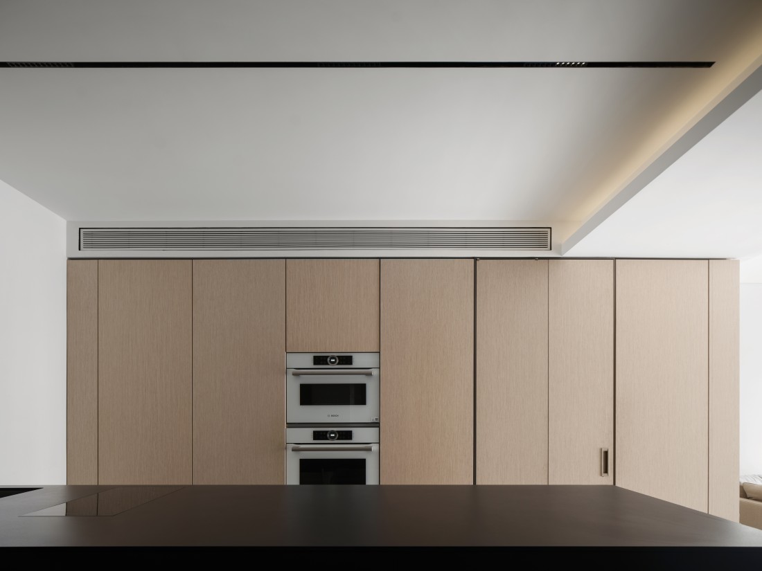 厨房、餐厅与客厅三者紧密相连,但各有其独特的空间感,展现出完美的统一与变化。岩板的可裁切性,根据空间需求被巧妙应用,完美铺设地面,不仅使空间显得更加宽敞,更增添了生活气息。岩板之间的缝隙与墙体相呼应,形成了一道道流畅的线条,散发出现代极简风格的魅力。