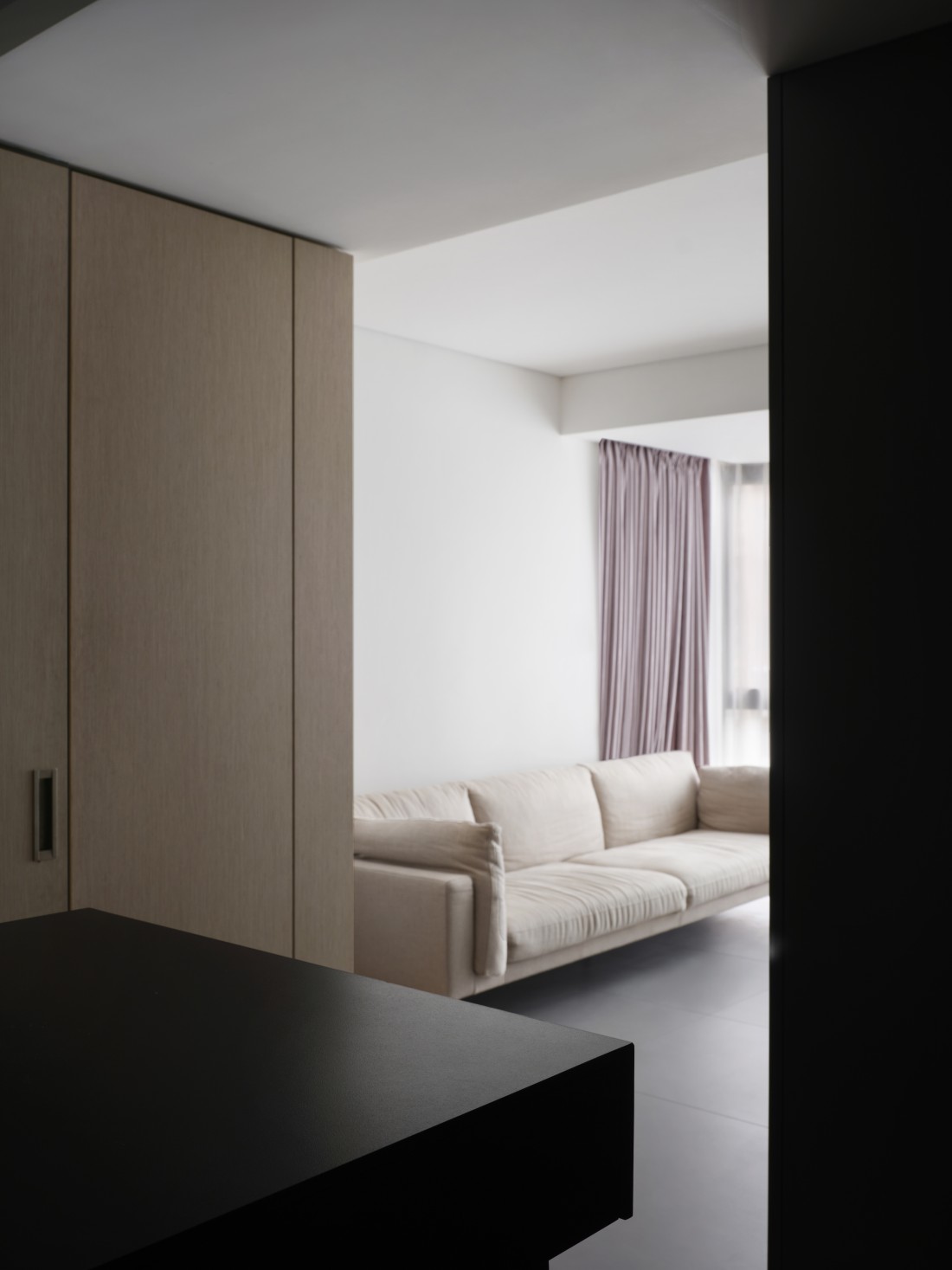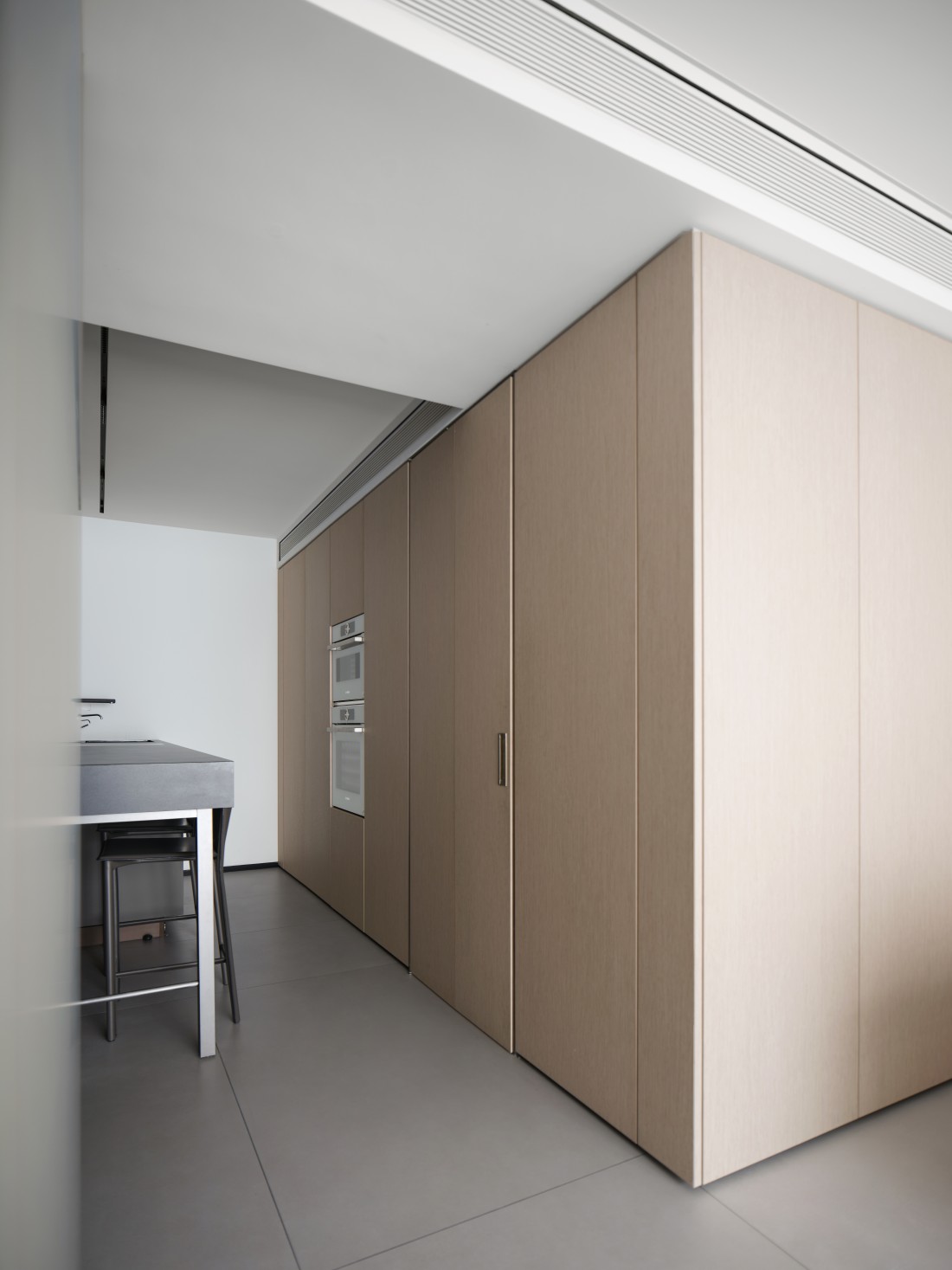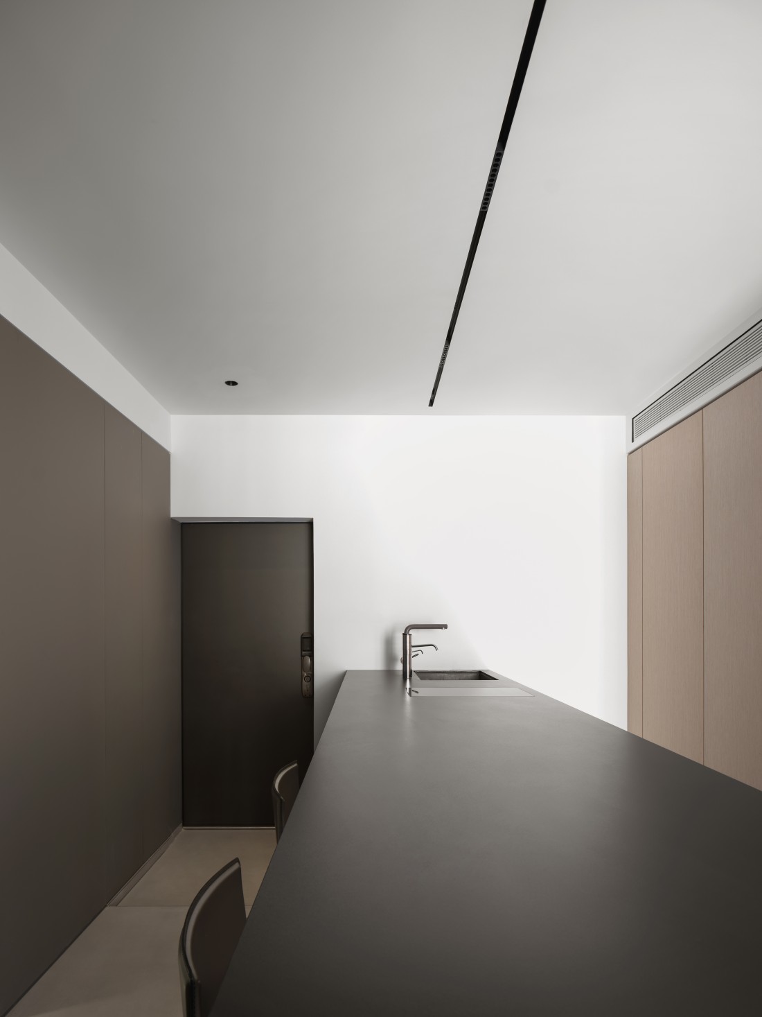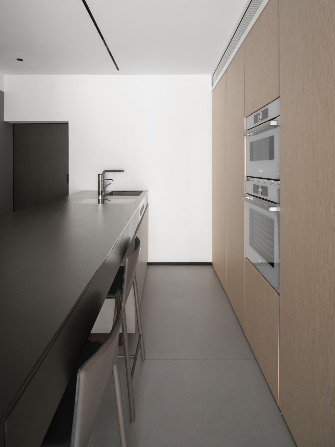 厨房、餐厅与客厅三者紧密相连,但各有其独特的空间感,展现出完美的统一与变化。岩板的可裁切性,根据空间需求被巧妙应用,完美铺设地面,不仅使空间显得更加宽敞,更增添了生活气息。岩板之间的缝隙与墙体相呼应,形成了一道道流畅的线条,散发出现代极简风格的魅力。