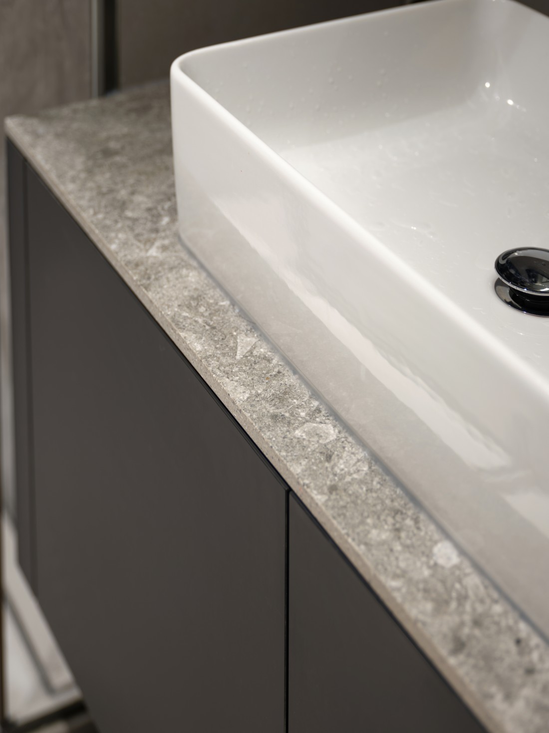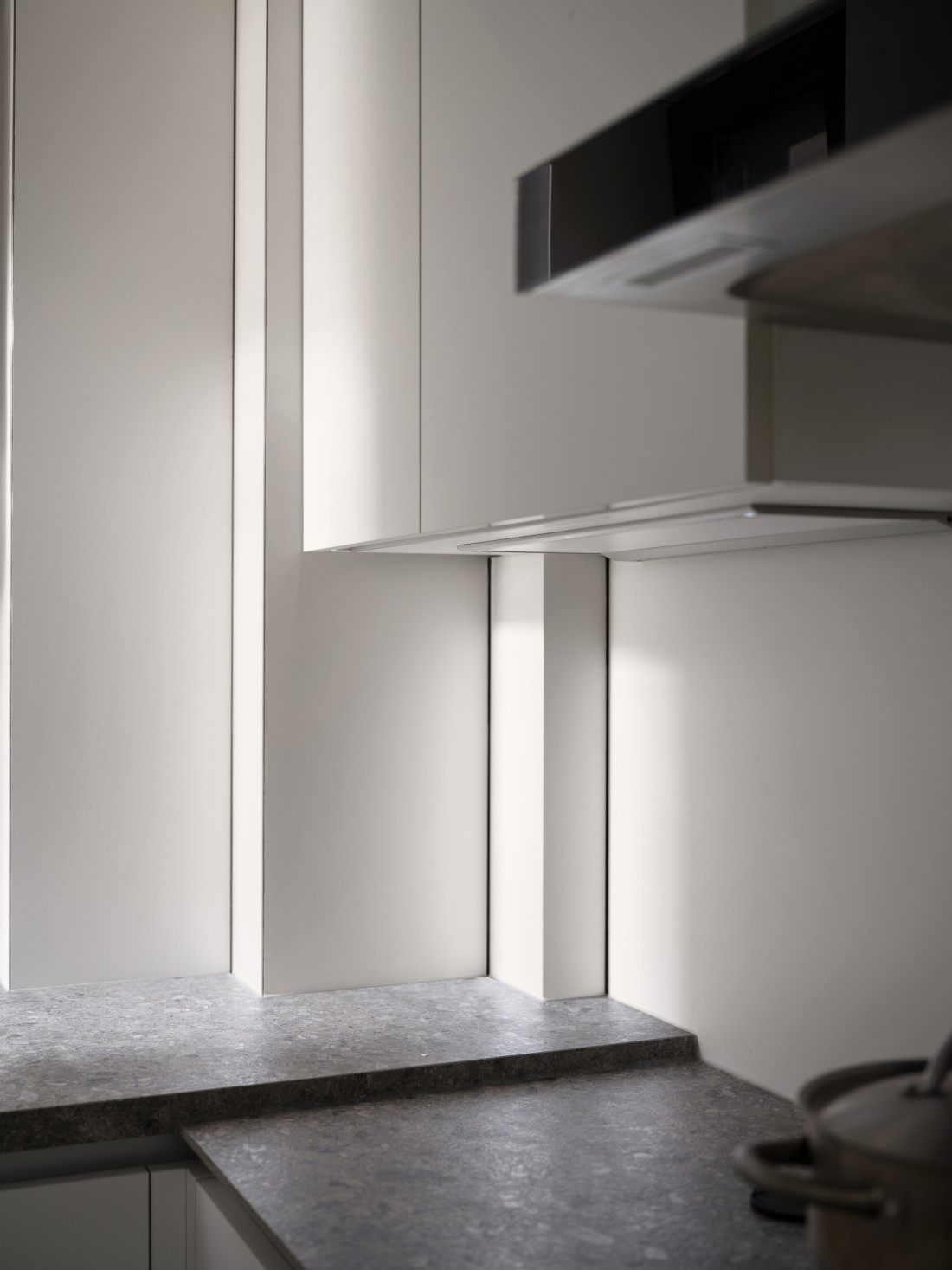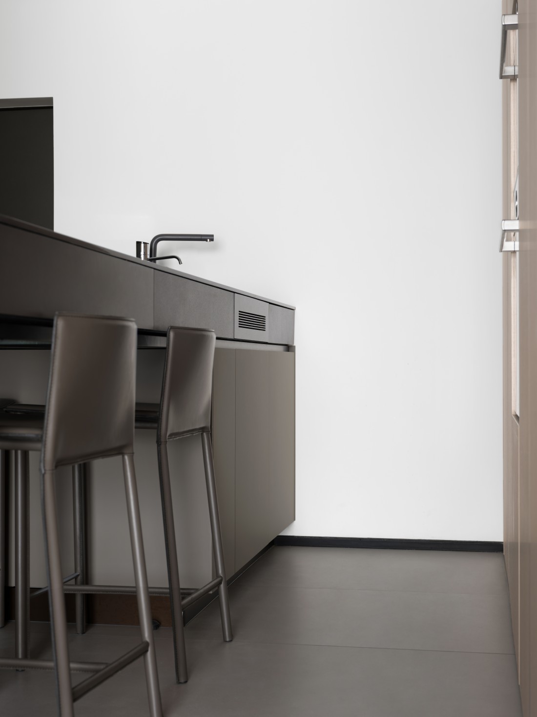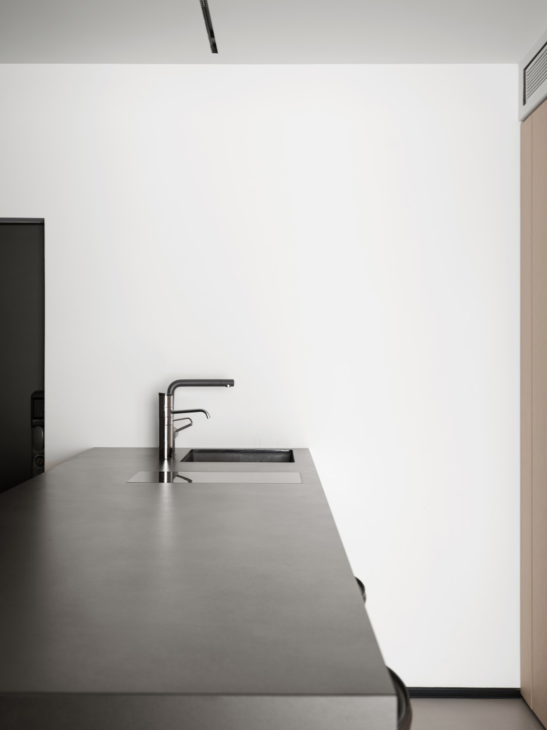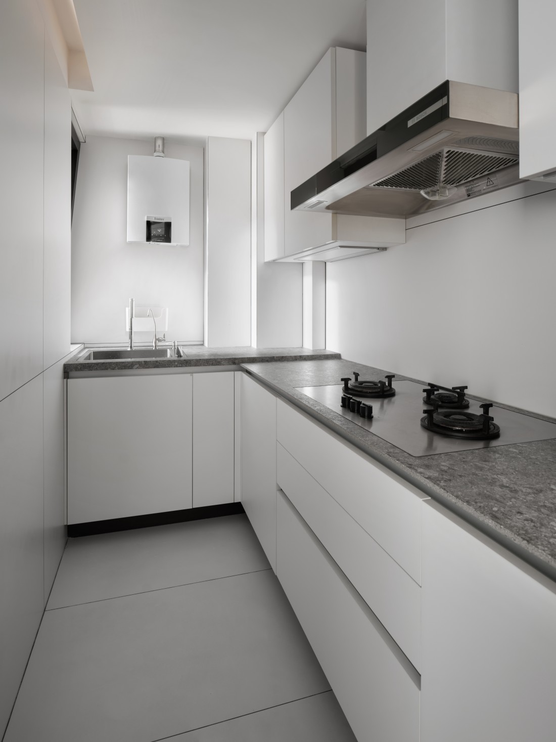 厨房、餐厅与客厅三者紧密相连,但各有其独特的空间感,展现出完美的统一与变化。岩板的可裁切性,根据空间需求被巧妙应用,完美铺设地面,不仅使空间显得更加宽敞,更增添了生活气息。岩板之间的缝隙与墙体相呼应,形成了一道道流畅的线条,散发出现代极简风格的魅力。